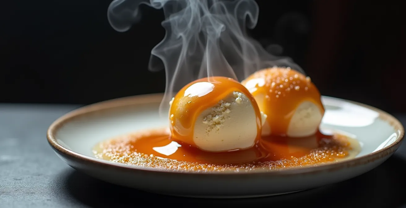 Avant même de déchiffrer une saveur complexe, notre palais réagit à une information bien plus primitive : la température. Le contraste chaud-froid est l’un des outils les plus puissants et directs pour créer un choc sensoriel immédiat. Il ne s’agit pas simplement de servir un plat tiède, mais de créer une collision thermique en bouche. Un cœur de sorbet glacé caché dans un soufflé brûlant, une tuile chaude posée sur une mousse glacée, une sauce chaude versée sur un carpaccio presque gelé… Ces associations forcent le cerveau à sortir de sa torpeur et à se focaliser intensément sur ce qui se passe. Cette « remise à zéro » perceptive amplifie la sensibilité aux goûts et aux textures qui suivent.