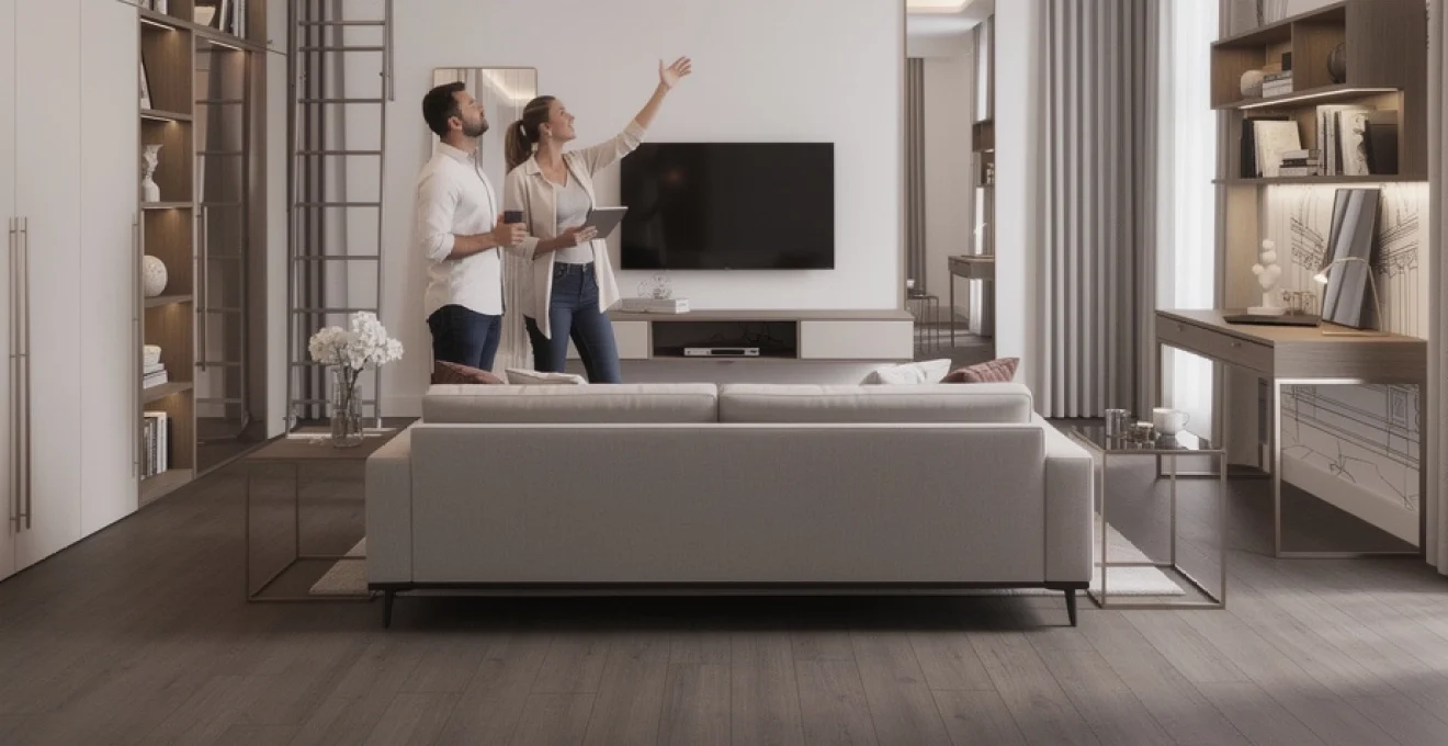 Avec 2m70 sous plafond, vous disposez d’une marge suffisante pour exploiter la verticalité sans étouffer la pièce. Le mobilier sur-mesure devient alors un levier puissant pour gagner de la place au sol tout en structurant les murs. L’objectif est d’occuper la hauteur de manière maîtrisée, en évitant l’effet « mur de placards » trop massif.